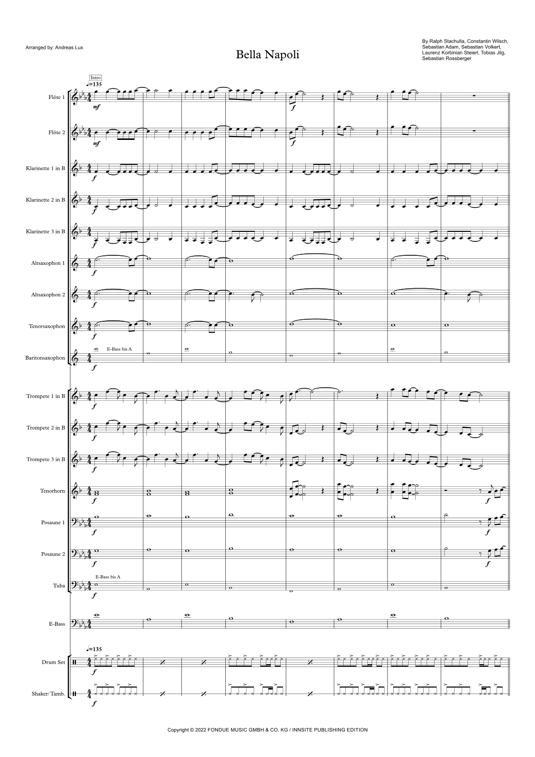 Der Party-Hit schlechthin mit viel Italo-Feeling Arrangiert für Blasorchester, mit einer Auswahl an Stimmen: Flöte 1/2, Klarinette 1 bis 3, Alt-Sax 1/2, Tenor-Sax, Bari-Sax, Trompete 1 bis 3, Tenorhorn, Posaune 1/2, Tuba in C, E-Bass, Drum-Set, Percussion NEU: Posaune 1 und 2 in Bb, Tuba in Bb (alles im Violinschlüssel) Oboe, Eb-Stimmen (Tuba, Posaune) und Horn folgen.