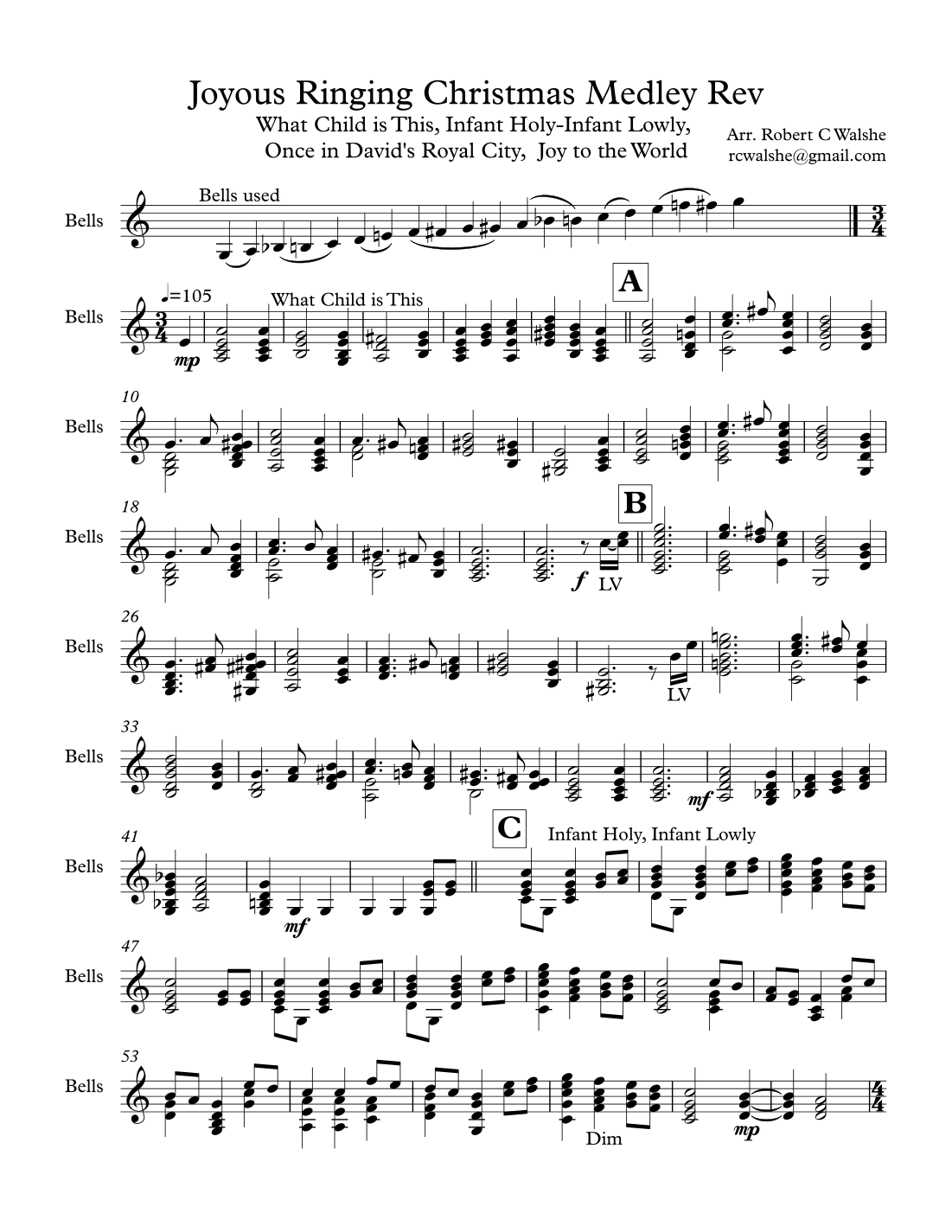 Joyous Ringing Christmas Medley for 2 Octave Handbells (arr. Robert C. Walshe) por Various Partituras para Campanas en Sheet Music Direct