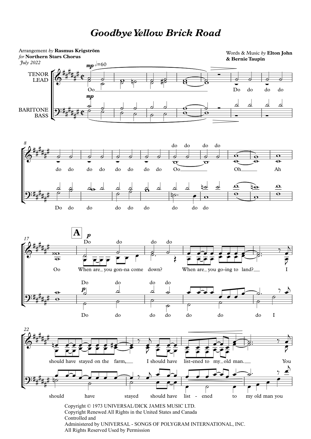 Goodbye Yellow Brick Road (arr. Rasmus Krigström) por Elton John Partituras para Cuarteto de Barbershop en Sheet Music Direct