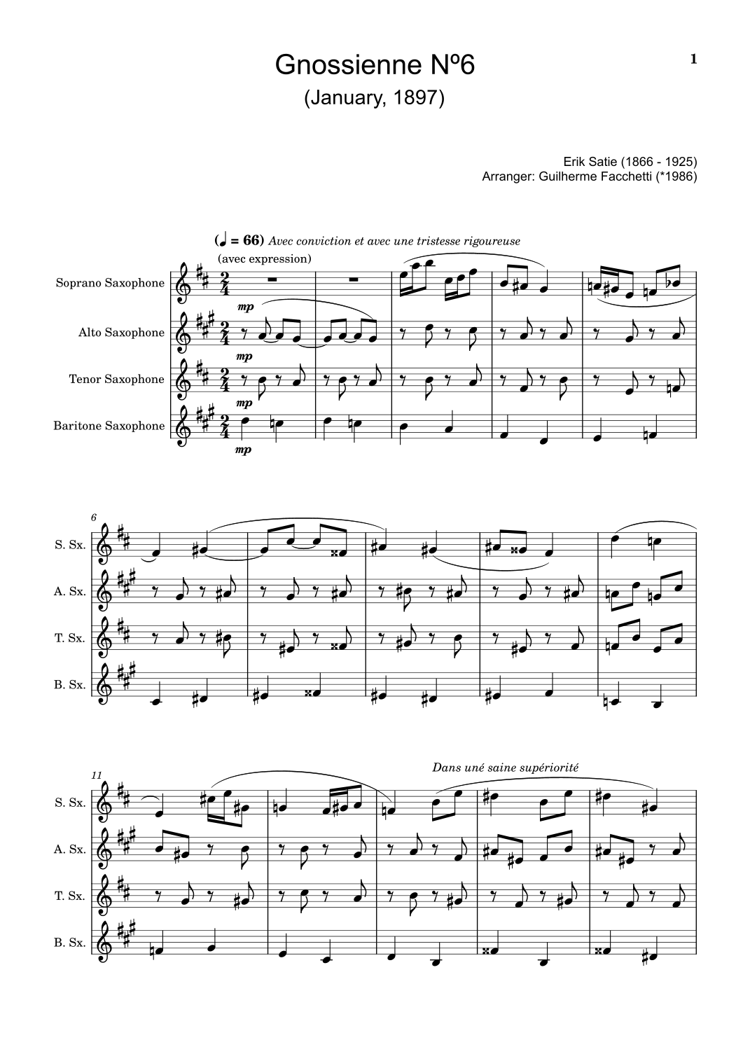 Vista previa interactiva de Partituras Digitales de 'Gnossienne Nº6 - Arranged for Saxophone Quartet. Score and Parts. (arr. Guilherme Facchetti' por Erik Satie, Agrupación Viento Madera page 1