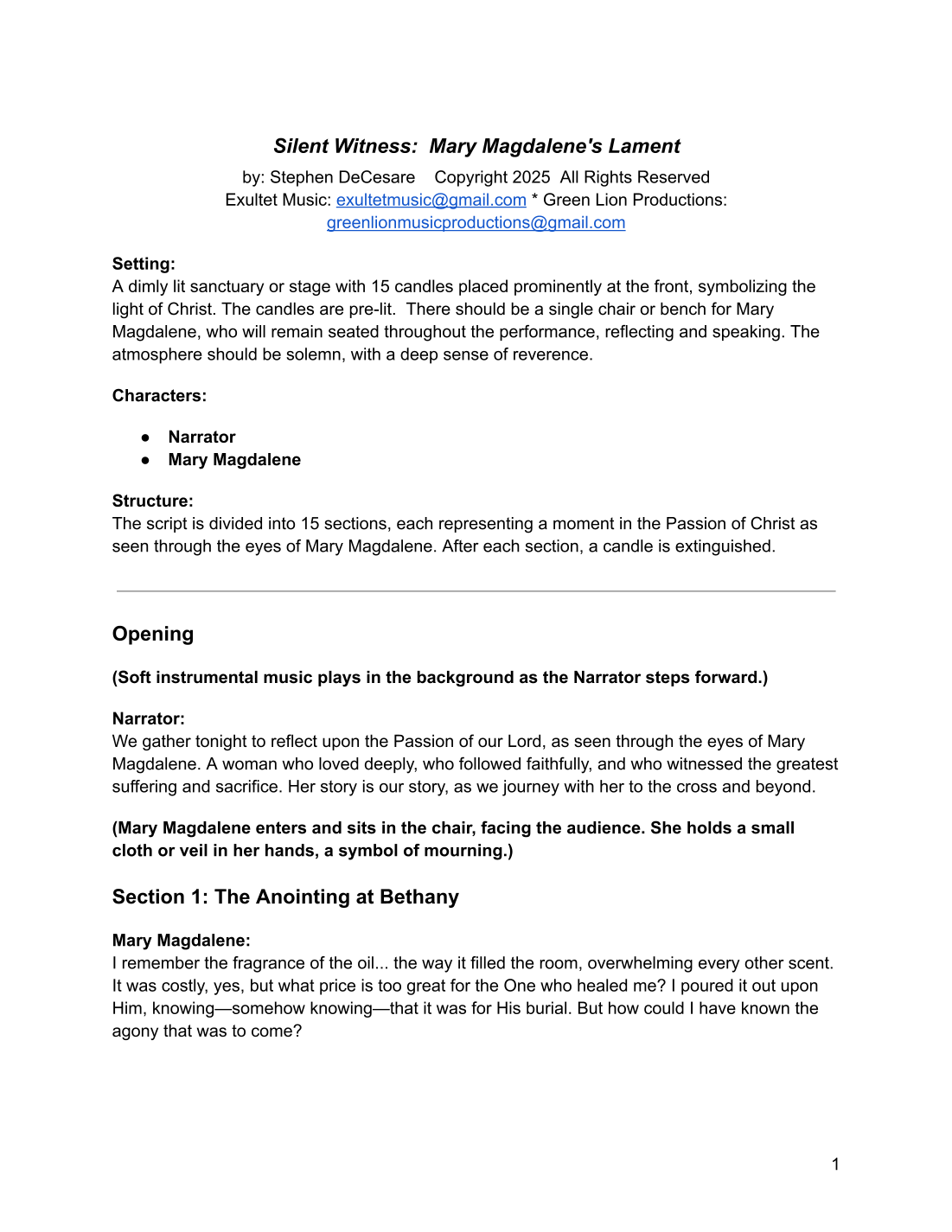 Vista previa interactiva de Partituras Digitales de 'Silent Witness: Mary Magdalene’s Lament (Tenebrae Service) (SATB version)' por Stephen DeCesare, SATB Coro page 1