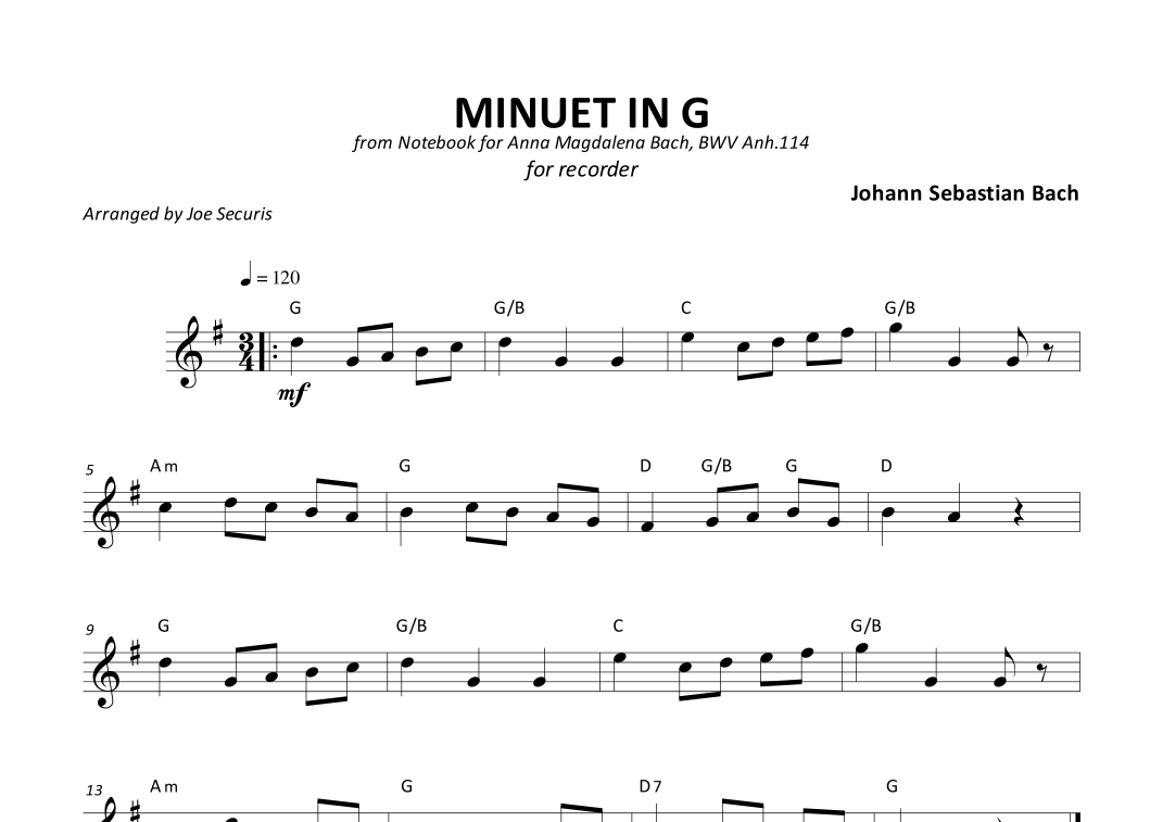 Minuet in G (arr. Joe Securis) por Johann Sebastian Bach Partituras para Recorder Solo en Sheet Music Direct