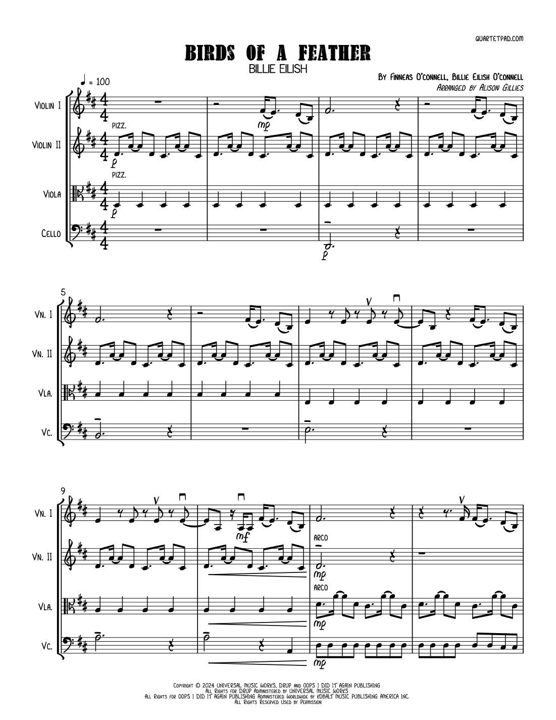 Aperçu interactif Partitions numériques> de 'Birds Of A Feather (arr. Alison Gillies)' par Billie Eilish, Quatuor à cordes page 1