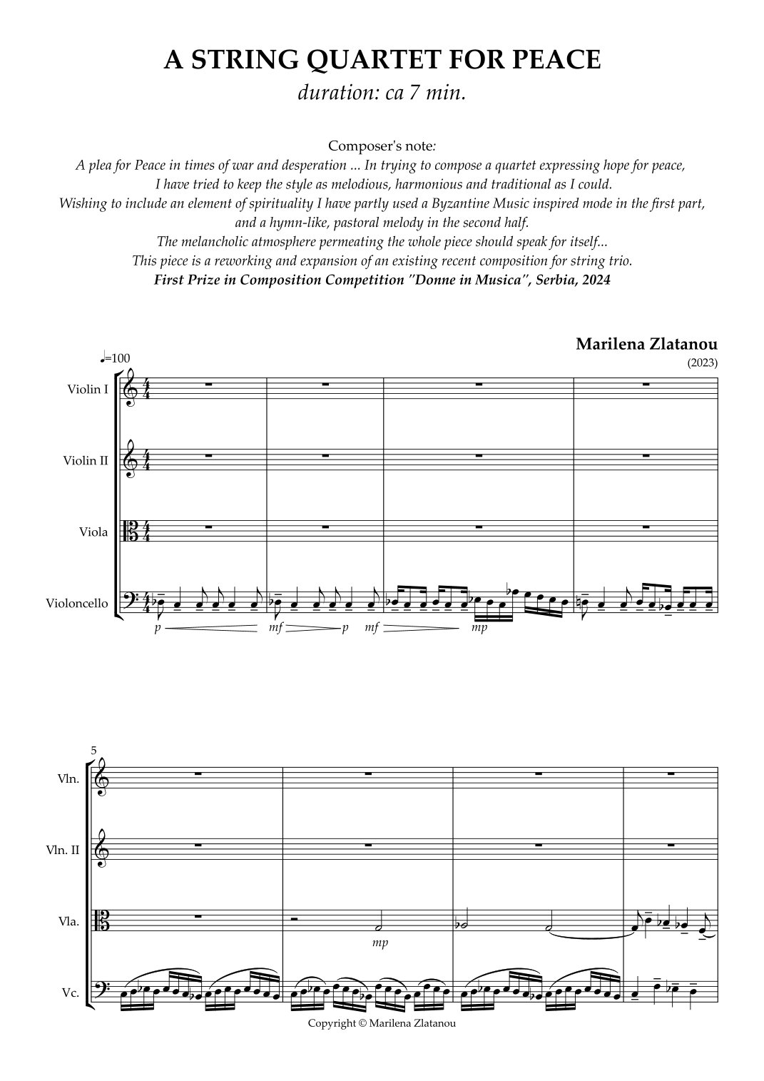A STRING QUARTET FOR PEACE par Marilena Zlatanou Partitions pour Quatuor à cordes sur Sheet Music Direct