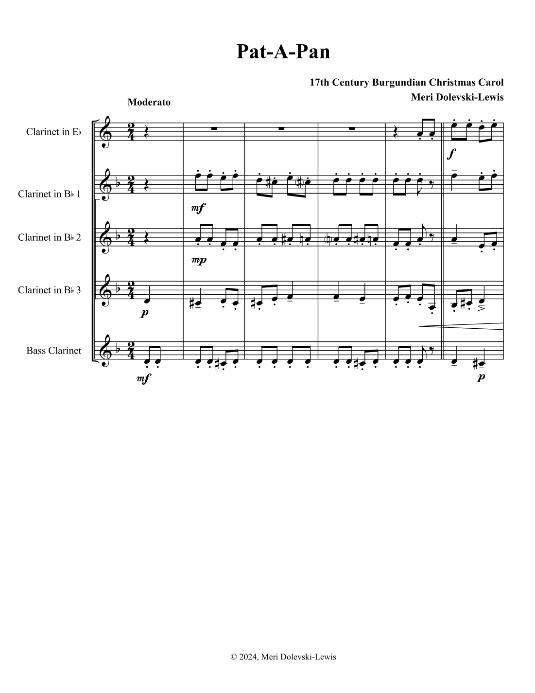 Aperçu interactif Partitions numériques> de 'Pat-a-Pan (Pat a Pan) (arr. Meri Dolevski)' par Unknown/17th century Burgundian Christmas carol, Ensemble Bois page 1