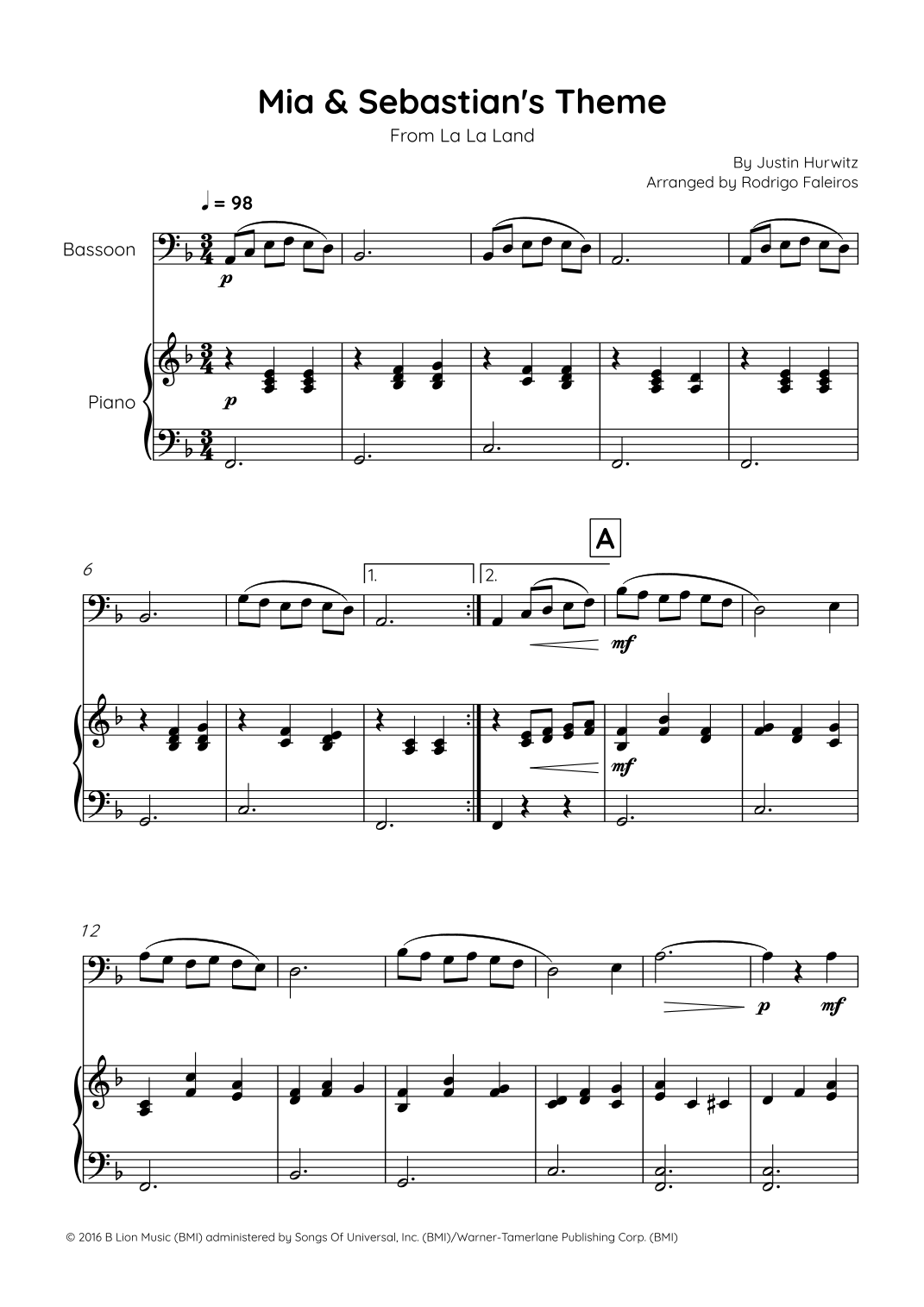 Aperçu interactif Partitions numériques> de 'Mia & Sebastian's Theme (arr. Rodrigo Faleiros' par Justin Hurwitz, Bassoon and Piano page 1