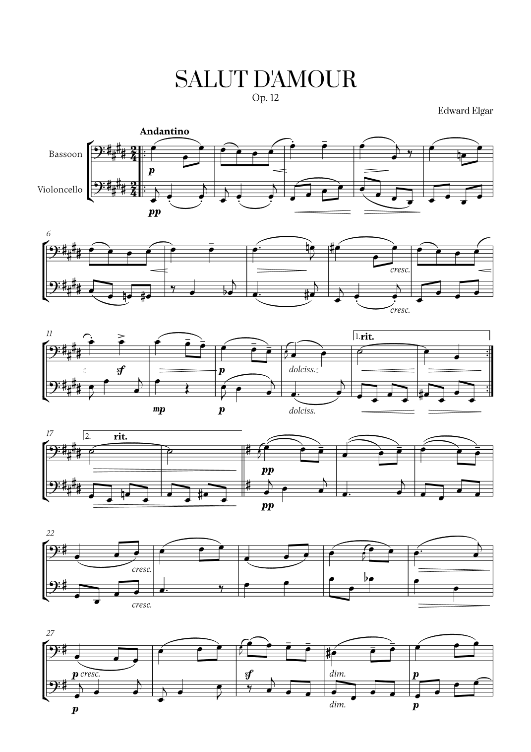 Aperçu interactif Partitions numériques> de 'Edward Elgar - Salut d'Amour (for Bassoon and Cello) (arr. Cadenza Editions)' par Edward Elgar, Duo Instrumentale page 1