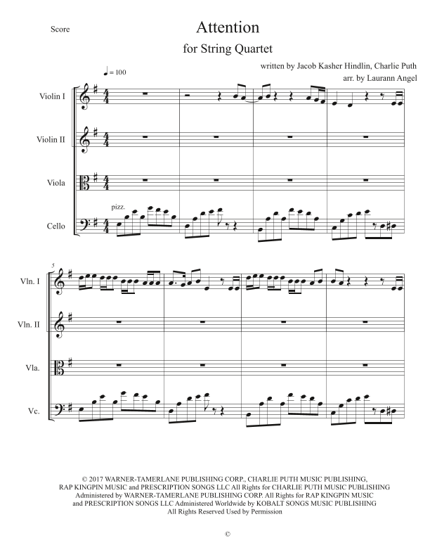 Attention (arr. Laurann Angel) par Charlie Puth Partitions pour Quatuor à cordes sur Sheet Music Direct