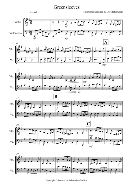 Aperçu interactif Partitions numériques> de 'Greensleeves for Violin and Cello Duet (arr. David Burndrett)' par Traditional, Duo Instrumentale page 1