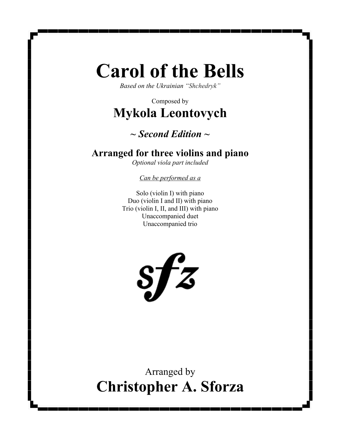 Purchase of Carol of the Bells, for three violins and piano (arr. Christopher A. Sforza) includes: