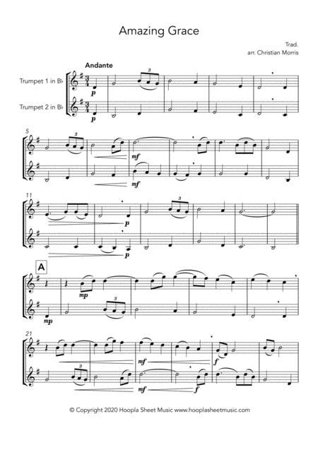 Interactive Digital Sheet Music preview of 'Amazing Grace (Fantasy) (arr. Christian Morris' by trad., Trumpet Duet page 1