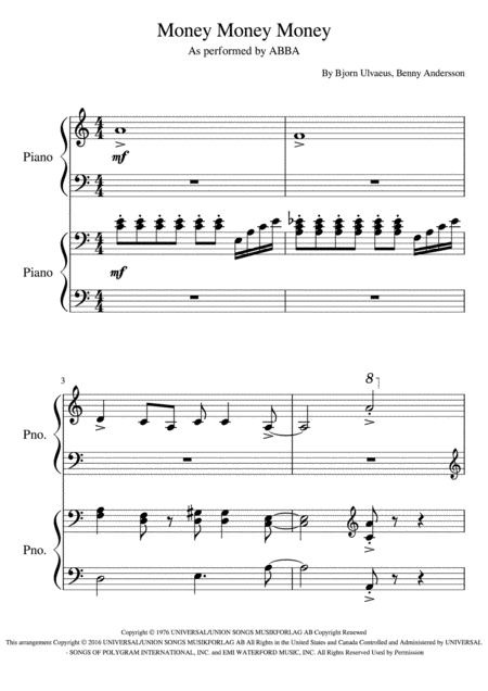 Keywords: easy piano duet, 1 piano 4 hands, beginner duet, ABBA piano arrangement, Money Money Money, includes fingering, studentfriendly sheet music, pop duet for lessons.