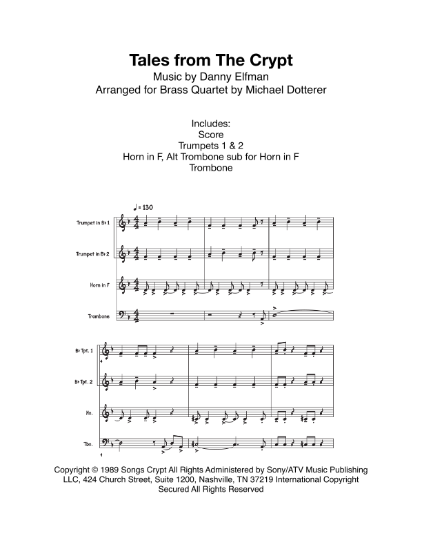 Theme from Tales From the Crypt arranged for Brass Quartet. Parts included: Score, Trumpets 1 & 2, Horn in F, Trombone, and an Alternate Trombone sub for Horn in F. Great for Halloween! Tales From the Crypt arranged for Brass Quintet. Parts included: Score, Trumpet 1, Trumpet 2, Horn in F, Alt Trombone (Horn in F), Trombone and Tuba. Great for Halloween. This arrangement is written for a few different types of ensembles. In the video demo, we combined two of the different ensembles, but it's basically the same arrangement. This video is also part of a medley combined with the Theme from The Munsters (which explains the abrupt ending in the video). For more info about the medley, visit www.hampton-brass.com.