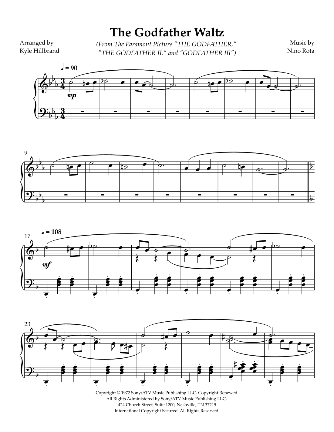 The Godfather Waltz (arr. Kyle Hillbrand) by Nino Rota Sheet Music for Piano Solo at Sheet Music Direct