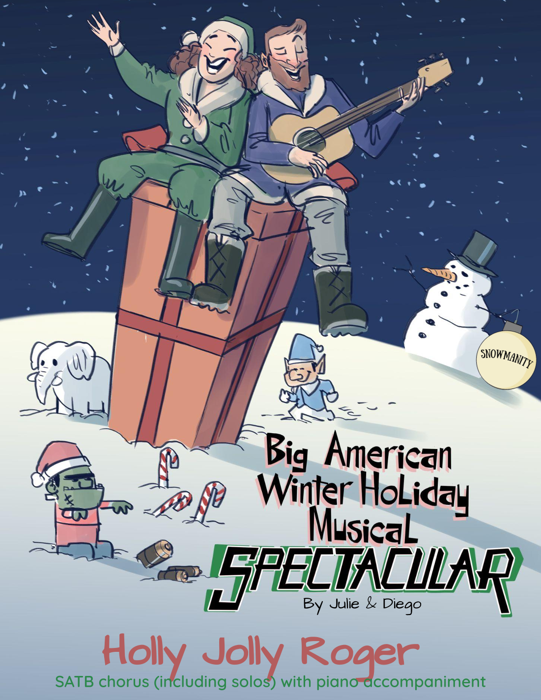 SATB with piano accompaniment. From The Big American Winter Holiday Musical Spectacular by Julie & Diego. This is the pirate Christmas song you never knew you needed. The Holly Jolly Roger is a pirate ship, and the captain sings about the "holidays on the sea". The first recitative verse (optional solos) regards a mermaid girlfriend, the second tells of mopping up the gifts the reindeer leave behind, and the final one implies the ship's parrot might make a fine Christmas feast. Great for caroling groups, school choirs and community choruses looking for a slightly silly, secular, swash-buckling song for their next holiday set.