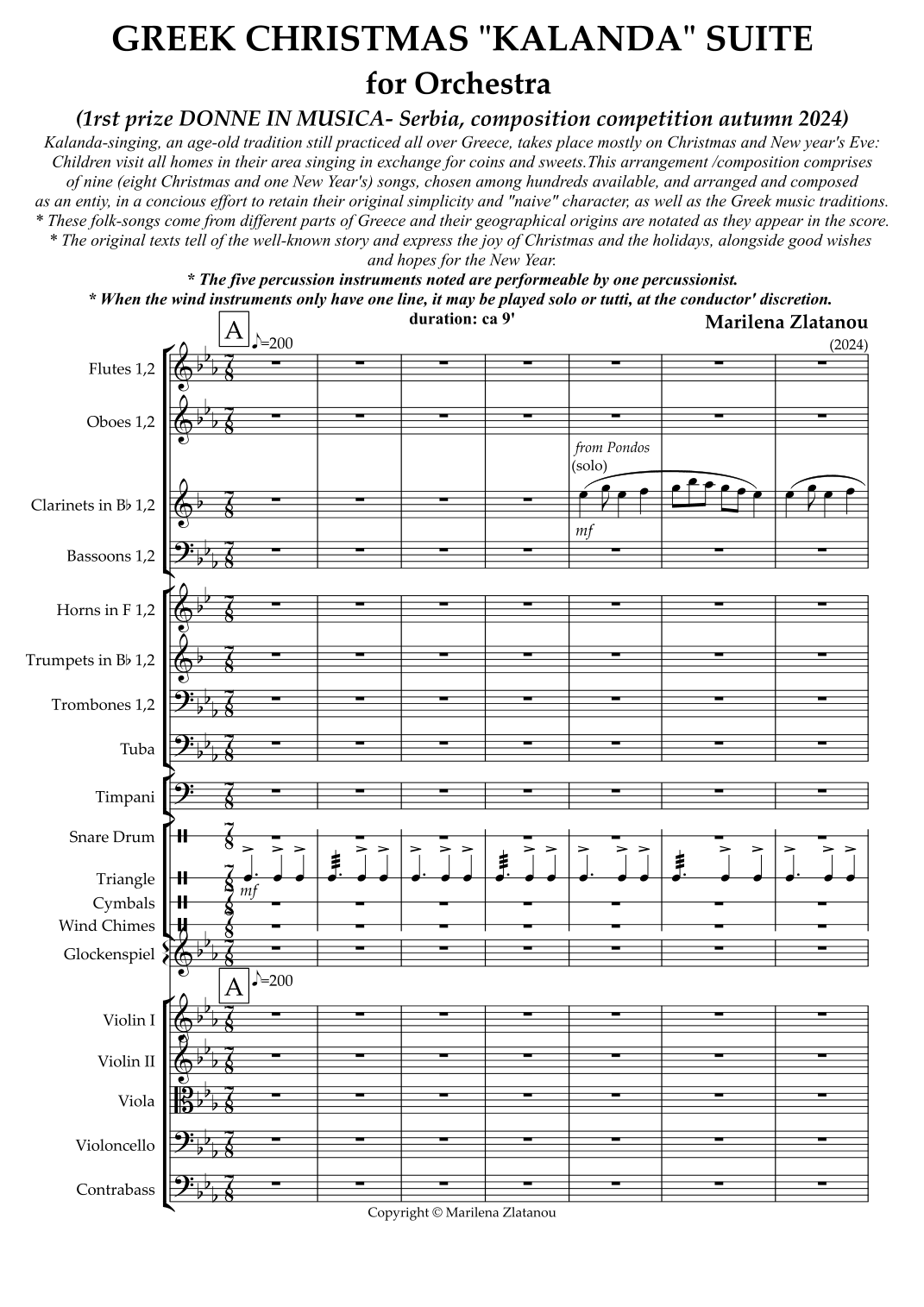 Kalanda-singing, an age-old tradition still practiced all over Greece, takes place mostly on Christmas and New year's Eve: Children visit all homes in their area singing in exchange for coins and sweets. This arrangement /composition comprises of nine (eight Christmas and one New Year's) songs, chosen among hundreds available, and arranged and composed as an entity, in a conscious effort to retain their original simplicity and "naive" character, as well as respect for the Greek music traditions. More detailed information on geographical origins of the songs used as well as performance suggestions are given in the score. The pdf file contains both the score and the parts of the piece.