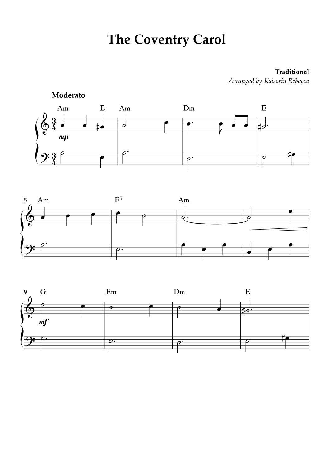 Interactive Digital Sheet Music preview of 'The Coventry Carol (arr. Kaiserin Rebecca' by Traditional, Easy Piano page 1