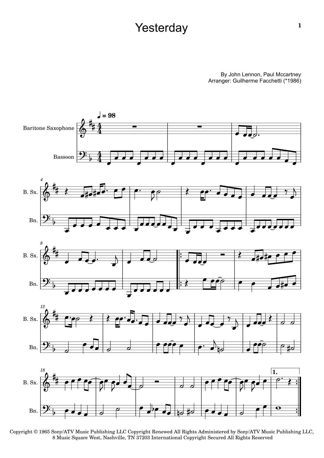 Explore the timeless beauty of Yesterday by John Lennon and Paul McCartney with this distinctive arrangement for baritone saxophone and bassoon. This iconic Beatles ballad, celebrated for its gentle melody and emotional depth, has been thoughtfully reimagined to highlight the warm, resonant tones of the baritone saxophone alongside the rich, expressive voice of the bassoon.