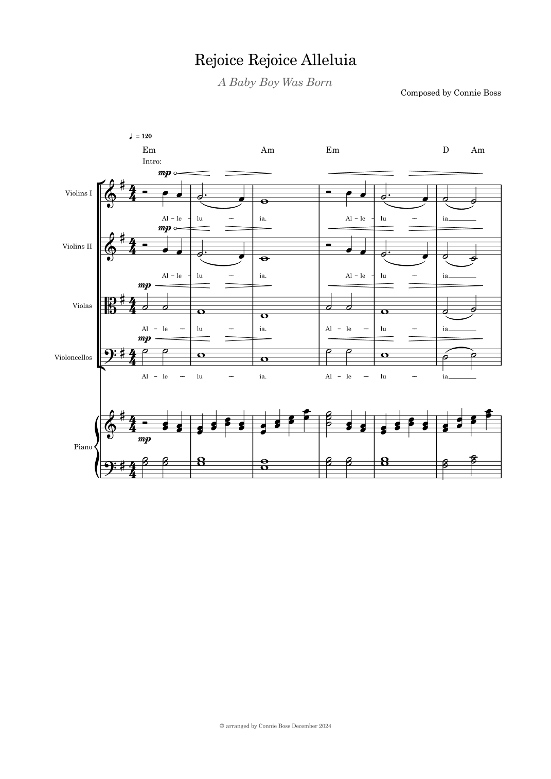 Interactive Digital Sheet Music preview of 'Rejoice Rejoice Alleluia (A Baby Boy Was Born) strings quartet with optional piano & with part pages' by Connie Boss, Performance Ensemble page 1