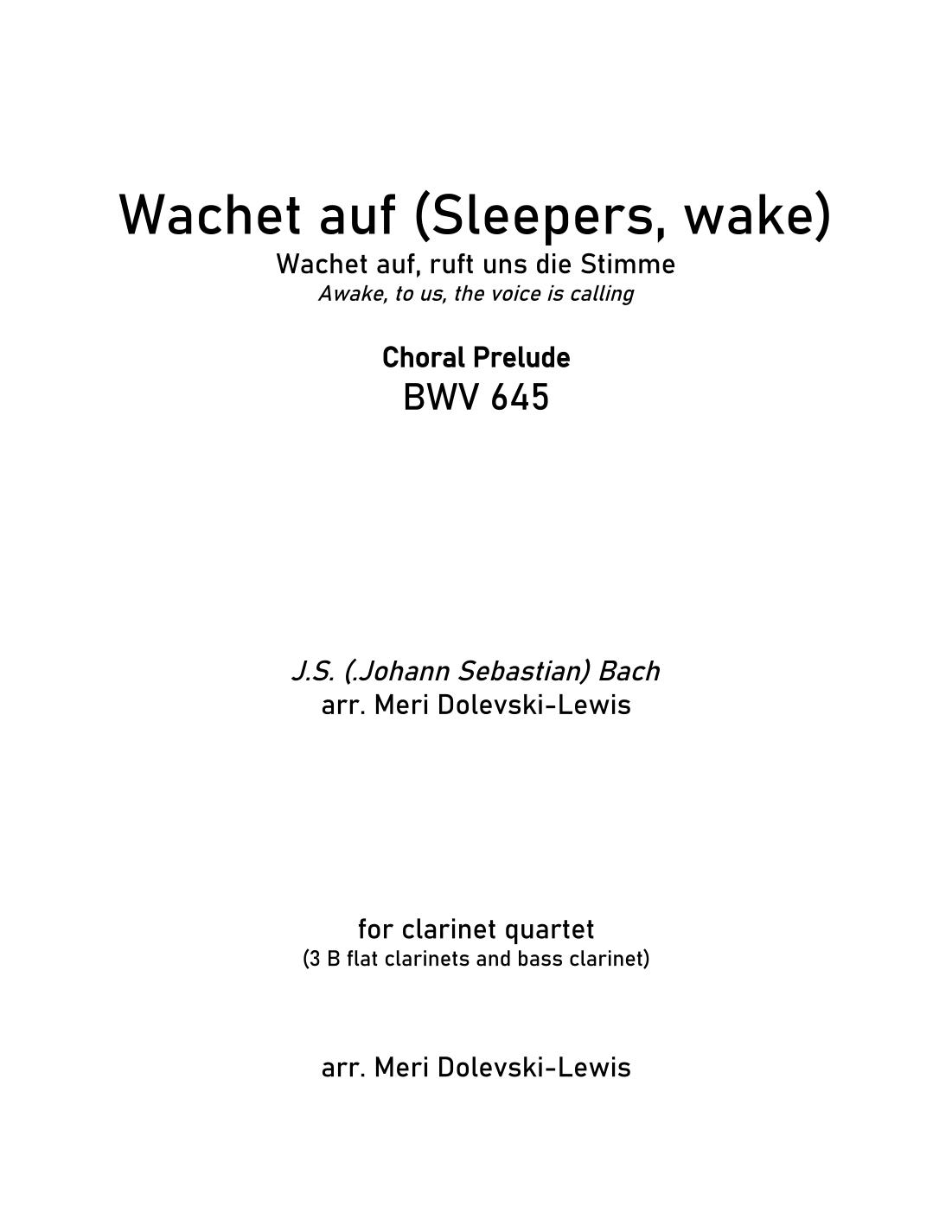 JS (Johann Sebastian) Bach: Choral prelude: Wachet auf (Sleepers, wake), BWV 645 (arr. Meri Dolevski) by J.S. Bach Sheet Music for Woodwind Ensemble at Sheet Music Direct