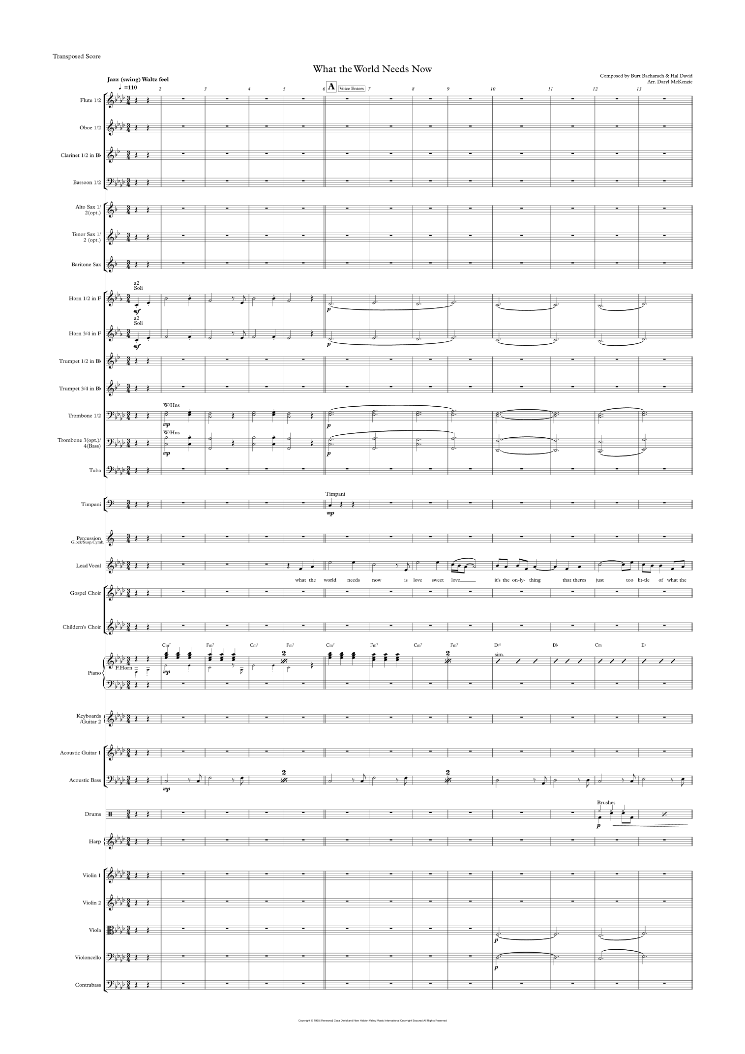 A moving orchestral arrangement of Burt Bacharachs timeless song What the World Needs Now Is Love, scored for Vocal with Choir (Childrens Choir, Gospel Choir, or standard Choir) and full Pops Orchestra. This version captures the warmth and expressive depth of the original while adding lush symphonic color, making it ideal for concert halls, gala events, or community celebrations.