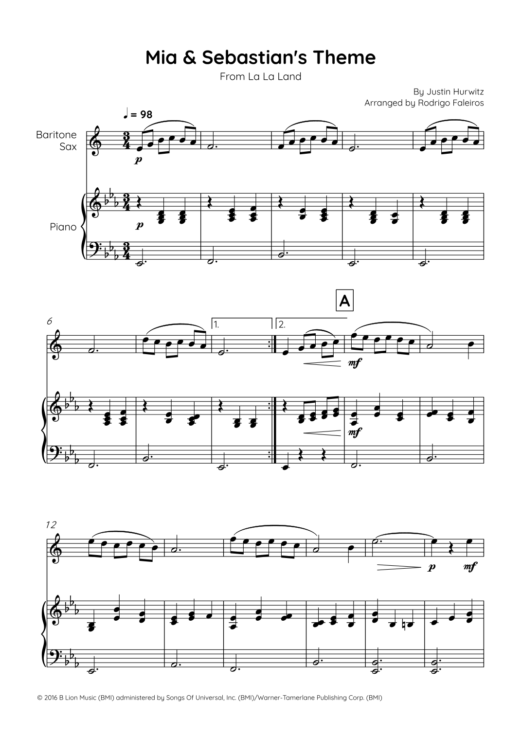 Mia & Sebastian's Theme (arr. Rodrigo Faleiros) by Justin Hurwitz Sheet Music for Baritone Sax and Piano at Sheet Music Direct
