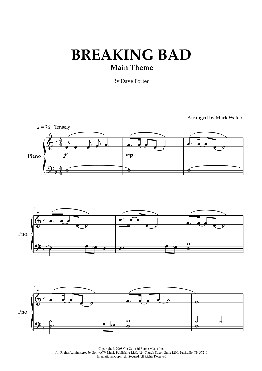 Breaking Bad Main Theme (arr. Mark Waters) by Dave Porter Sheet Music for Easy Piano at Sheet Music Direct