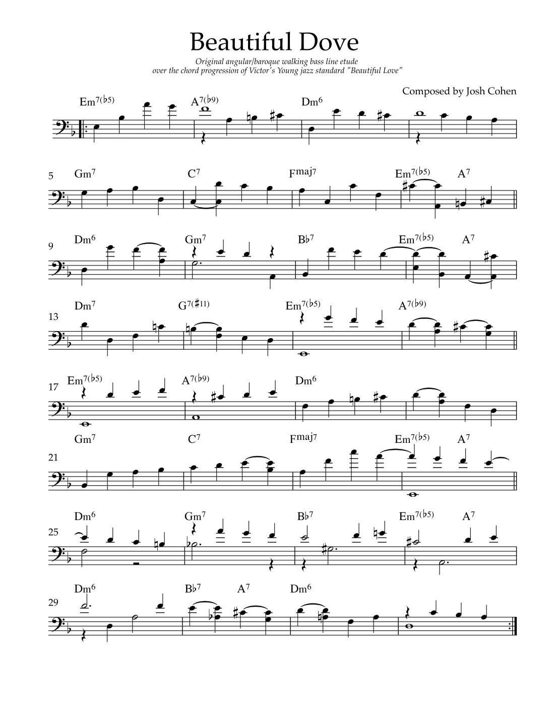 Beautiful Dove is an original walking bass line etude written over the chord changes to Victor Youngs jazz standard Beautiful Love. Blending angular, disjunct motion with Baroque-inspired sensibilities, this piece explores implied counterpoint and linear voice leading within a single melodic bass line.