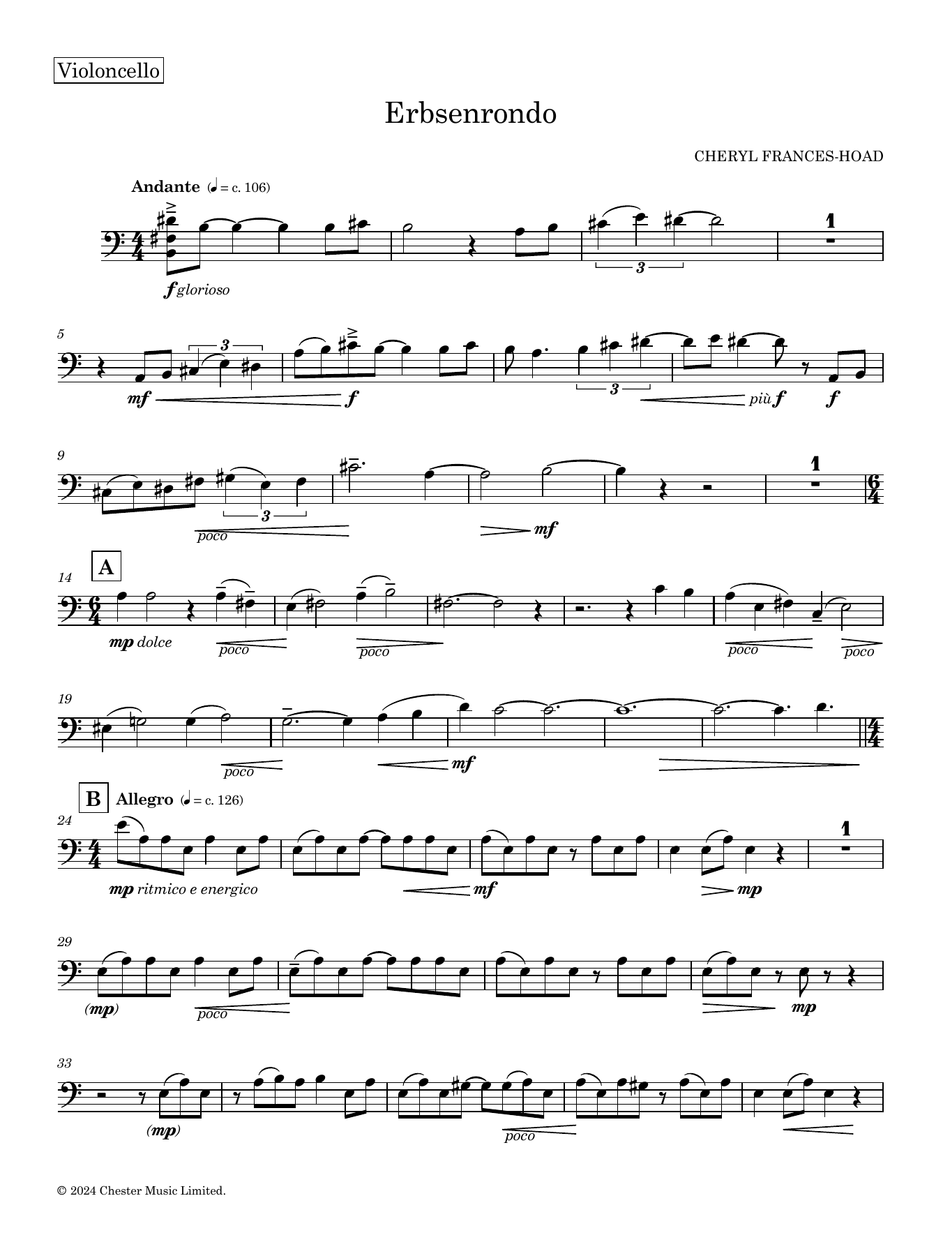 Interactive Digital Sheet Music preview of 'Erbsenrondo - Violoncello' by Cheryl Frances-Hoad, String Quartet page 1