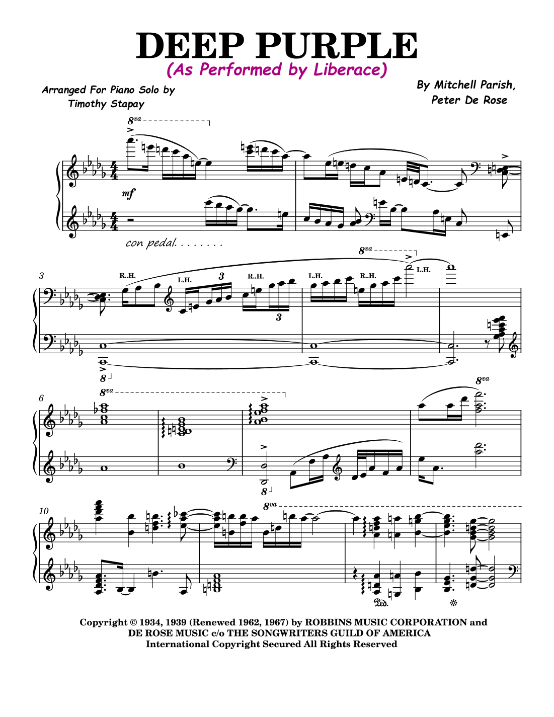 Deep Purple (arr. Timothy Stapay/Liberace) by Nino Tempo & April Stevens Sheet Music for Piano Solo at Sheet Music Direct