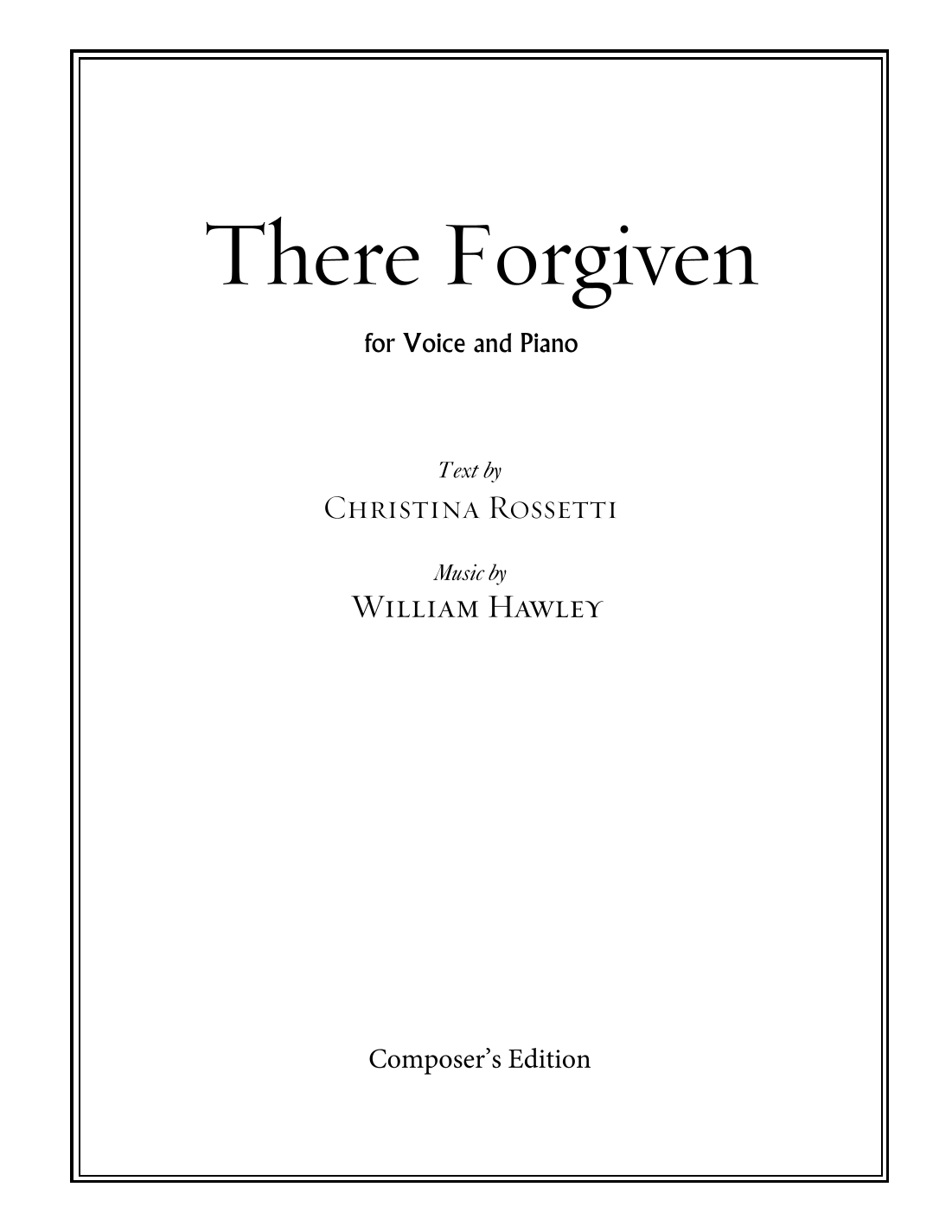 This is the score of William Hawley's There Forgiven, for Voice and Piano, setting a text by Christina Rossetti. The Audio Sample is the complete Composer's Demo recording. Performance duration: 1.75 minutes. ASCAP https://williamhawley.net