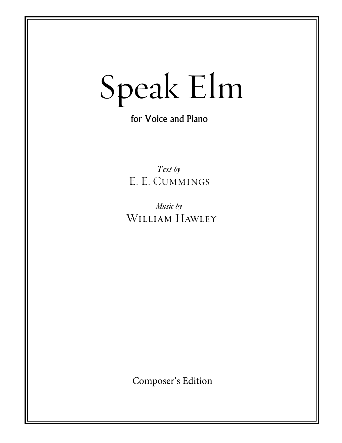 This is the score of William Hawley's Speak Elm, for Voice and Piano, setting a text by E. E. Cummings. The Audio Sample is the complete Composer's Demo recording. Performance duration: 1.5 minutes. ASCAP https://williamhawley.net