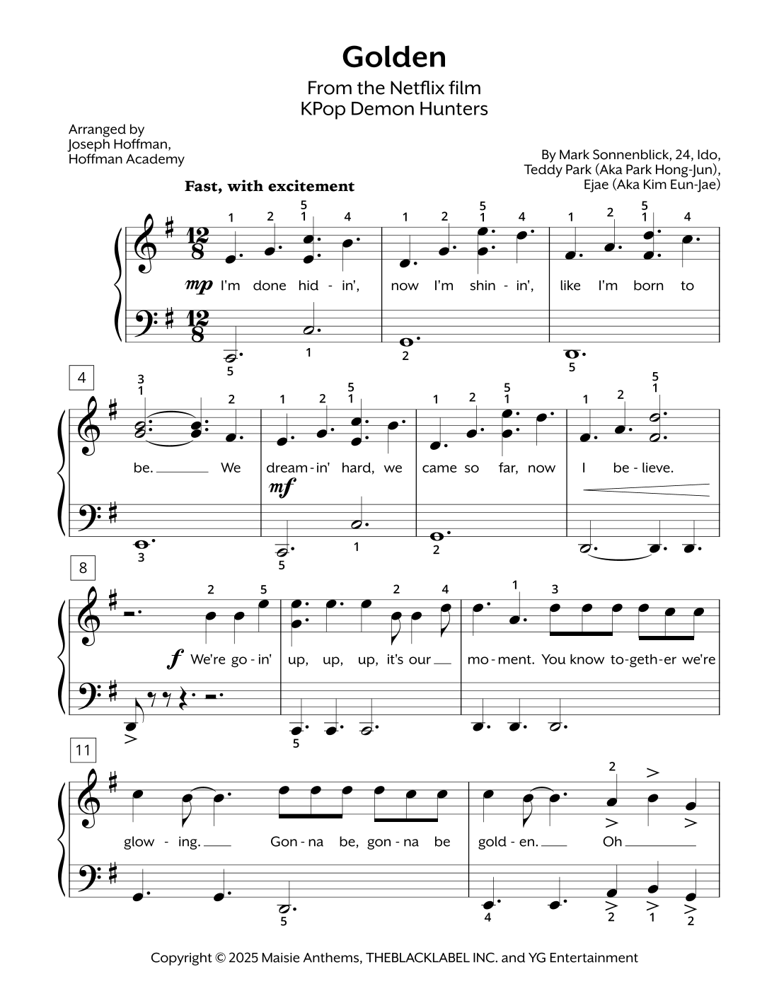 Golden (arr. Joseph Hoffman, Hoffman Academy - Late Elementary) by Huntr/X (Ejae, Audrey Nuna And Rei Ami) Sheet Music for Easy Piano at Sheet Music Direct
