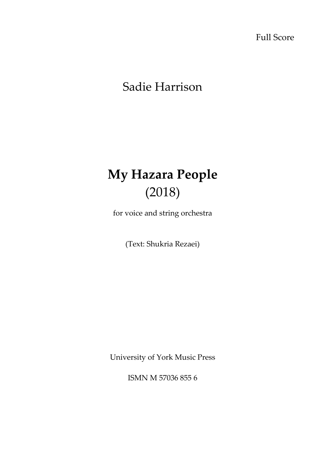 My Hazara People was commissioned by Cayenna Ponchione and the Orchestra of St Johns, for the orchestras 2018-2019 Displaced Voices project, which amplifies the voices of young refugees through music. The work was premiered by Charlotte Tetley and the Orchestra of St. Johns (conducted by Cayenna Ponchione) at the OSJs 50th Anniversary Concert at Dorchester Abbey on 30 November 2018.