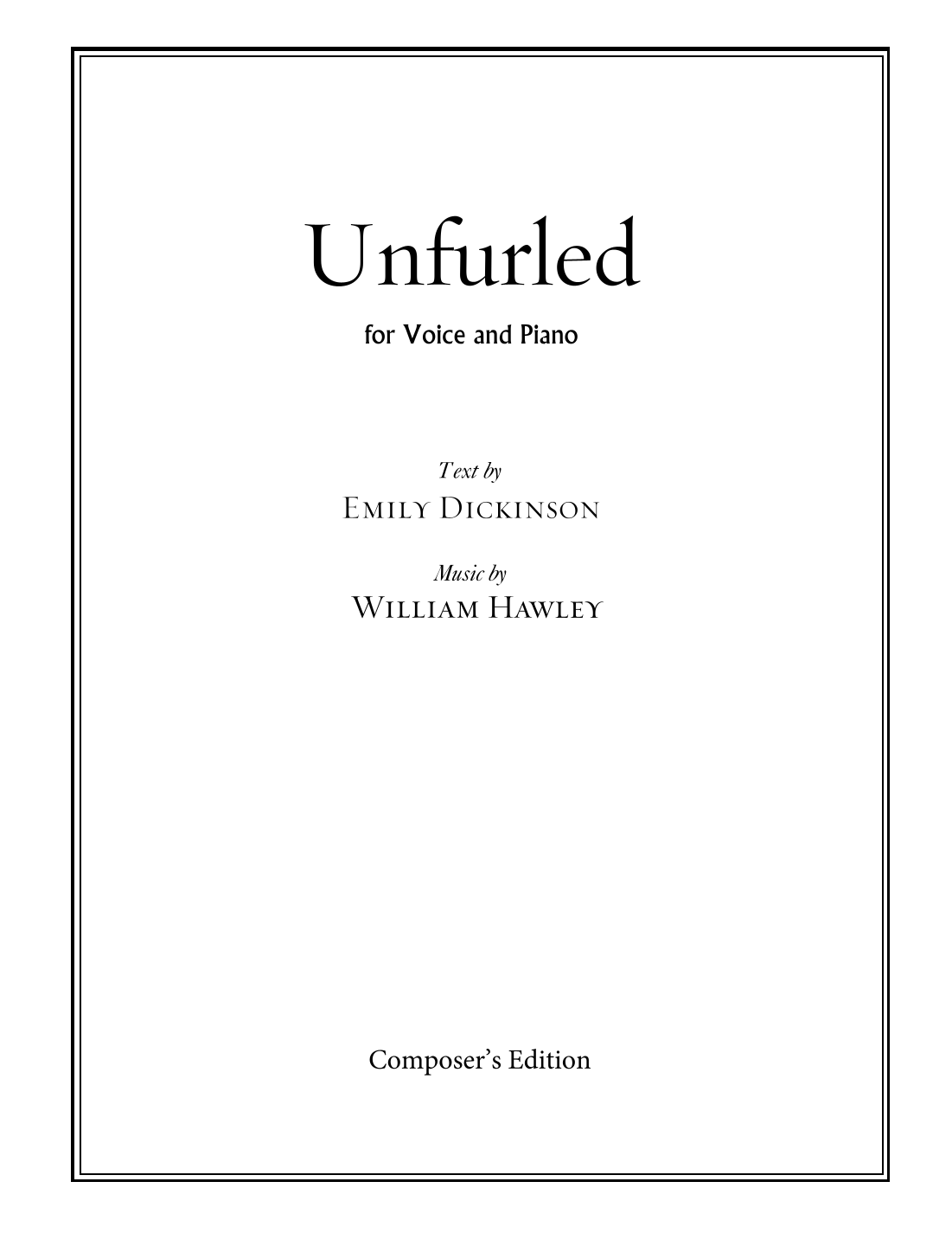 This is the score of William Hawley's Unfurled, for Voice and Piano, setting a text by Emily Dickinson. The Audio Sample is the complete Composer's Demo recording. Performance duration: 1.5 minutes. ASCAP https://williamhawley.net