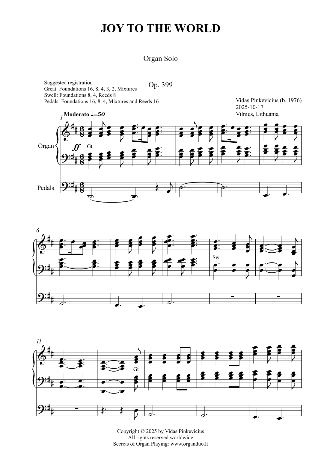Interactive Digital Sheet Music preview of 'Joy to the World, Op. 399 (Organ Solo)' by Vidas Pinkevicius, Organ page 1