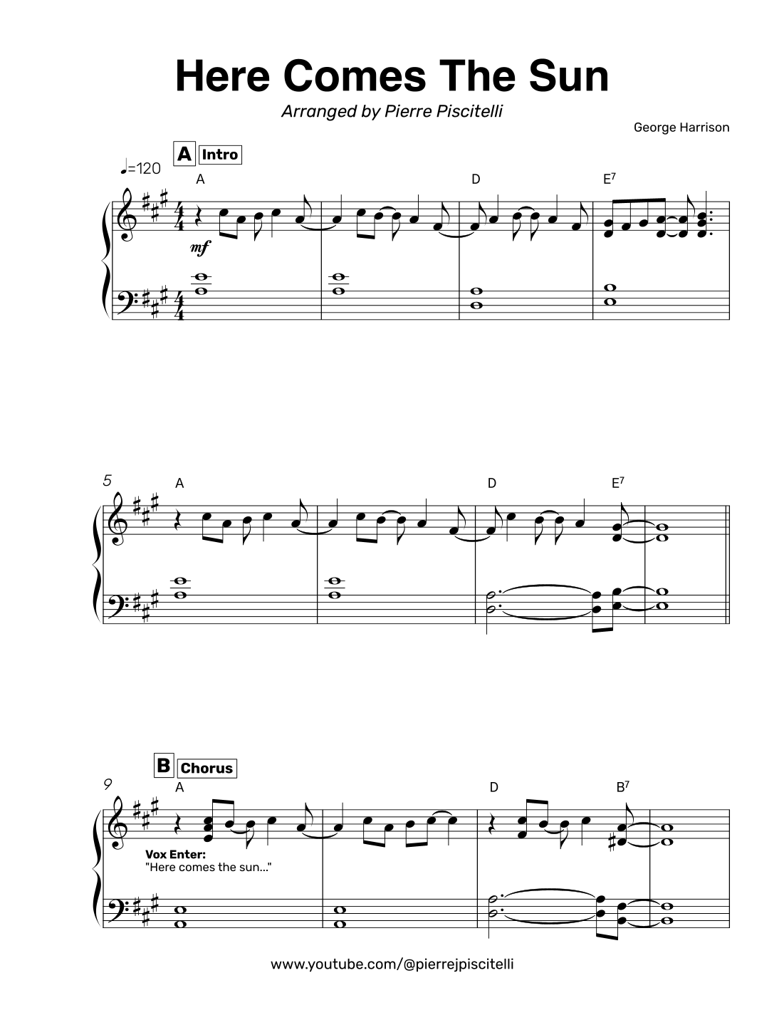 Here Comes The Sun (arr. Pierre Piscitelli) by The Beatles Sheet Music for Piano Solo at Sheet Music Direct