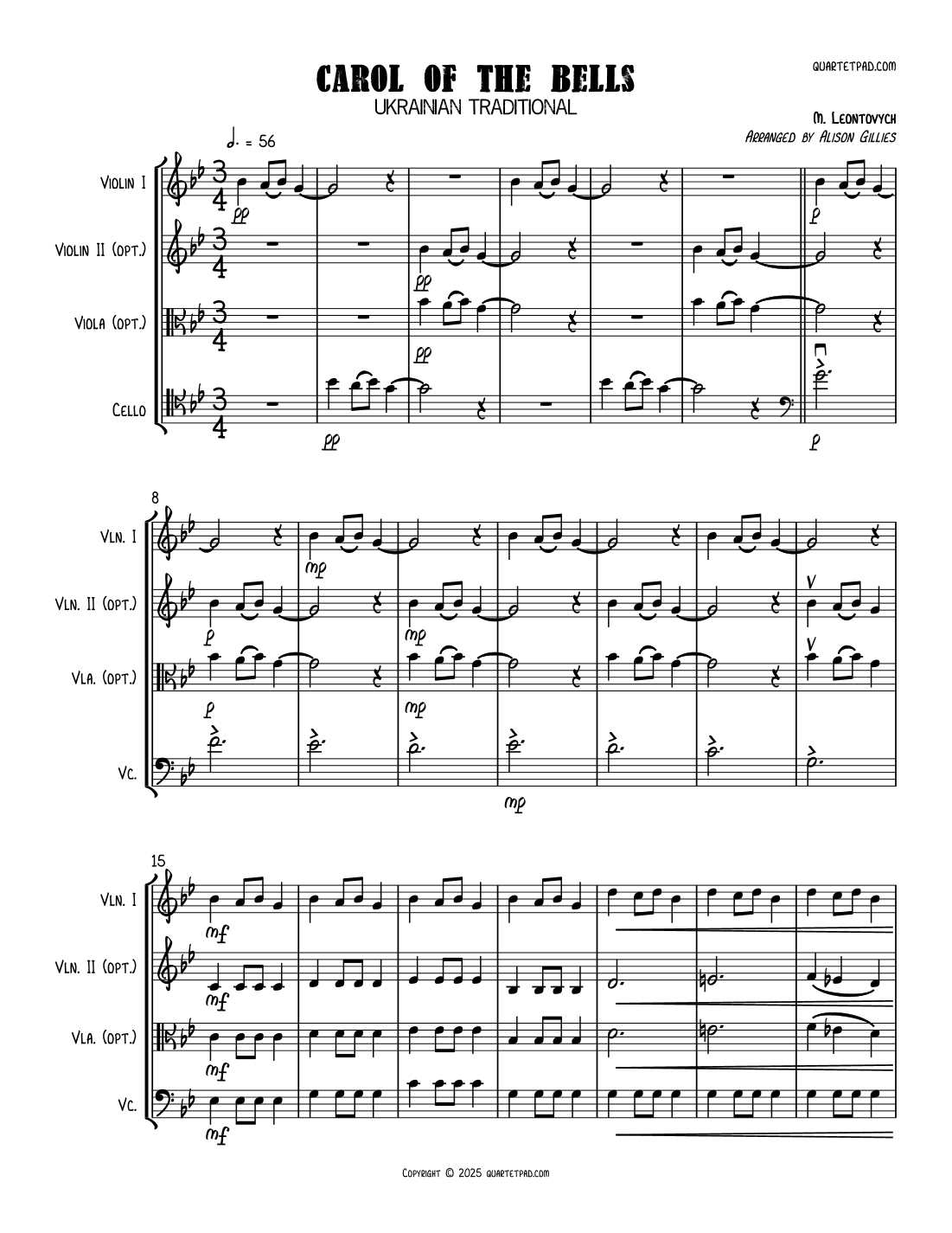 Carol Of The Bells by Mykola Leontovych arranged for String Trio (option for 2nd violin OR viola) by Alison Gillies.