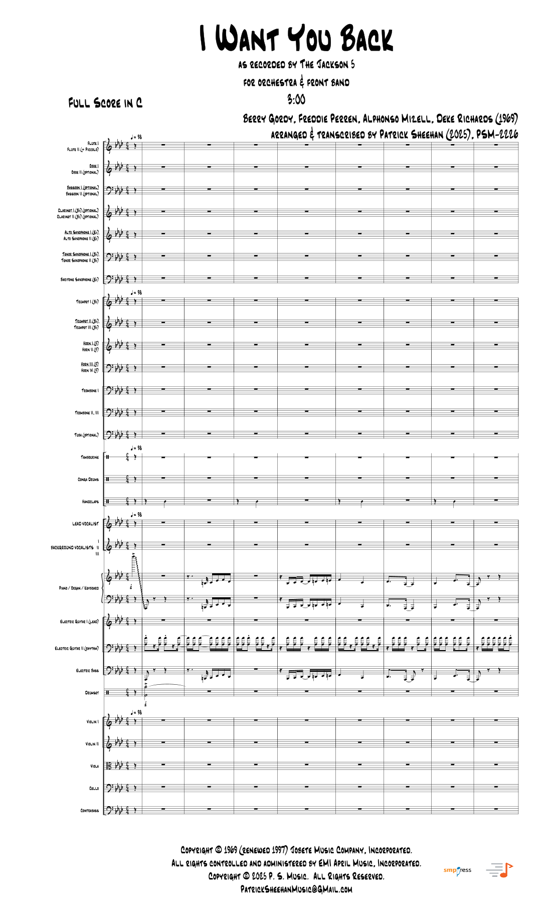 ABOUT THE ARRANGER: Patrick Sheehan has served as a professional music arranger, transcriptionist and copyist since 1999, and has over 2,000 works in his catalog spanning various genres: wind band, orchestra, chamber music, along with pop & rock selections. His modus operandi centers around creating arrangements and transcriptions that are true to the original definitive versions and strives to produce clean and easy-to-read music. For questions or more information, please contact the arranger at [email protected].