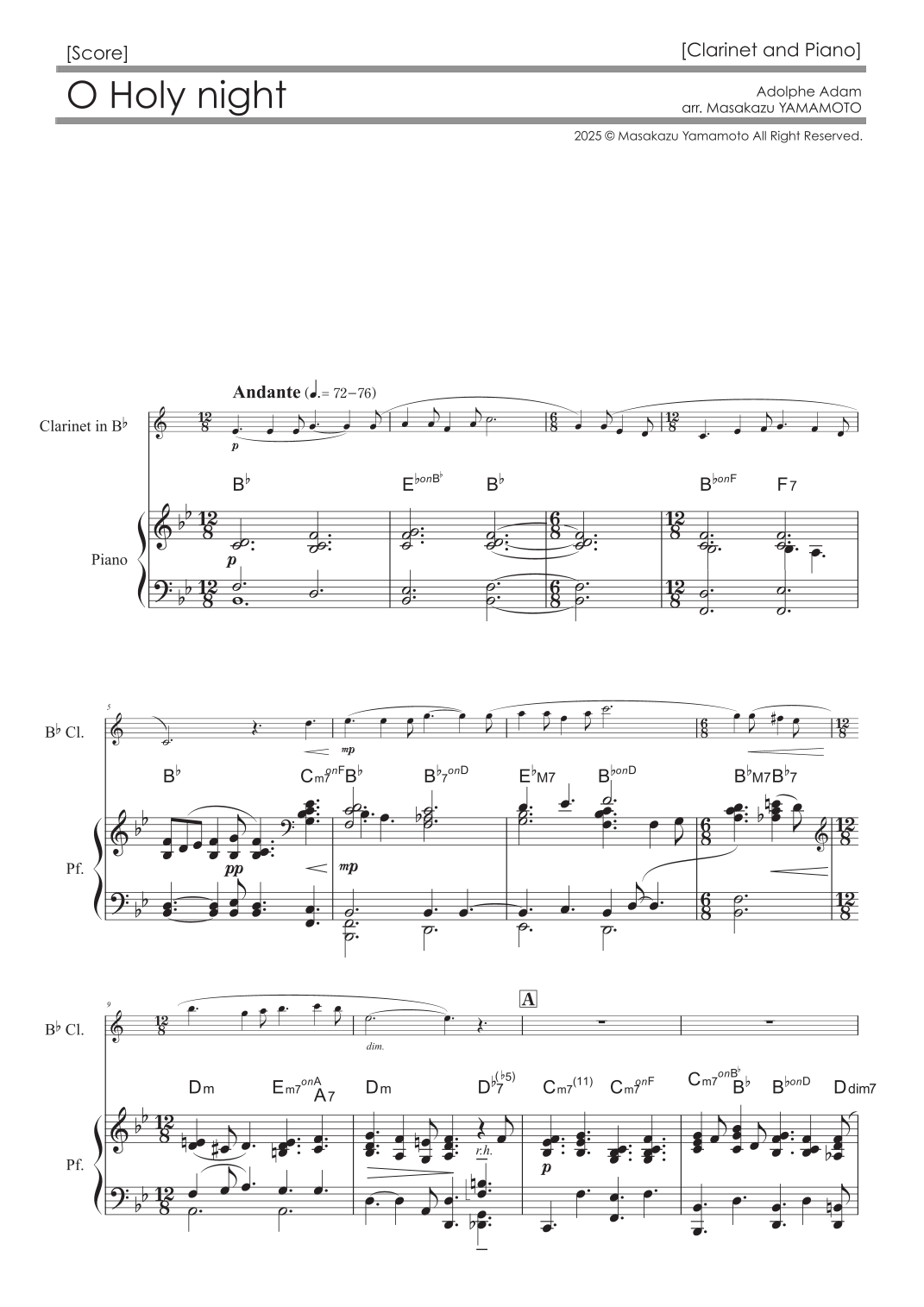Interactive Digital Sheet Music preview of 'O Holy Night [Clarinet and Piano / Christmas Music Arr.] (arr. Masakazu YAMAMOTO)' by Adolphe Adam, Clarinet and Piano page 1
