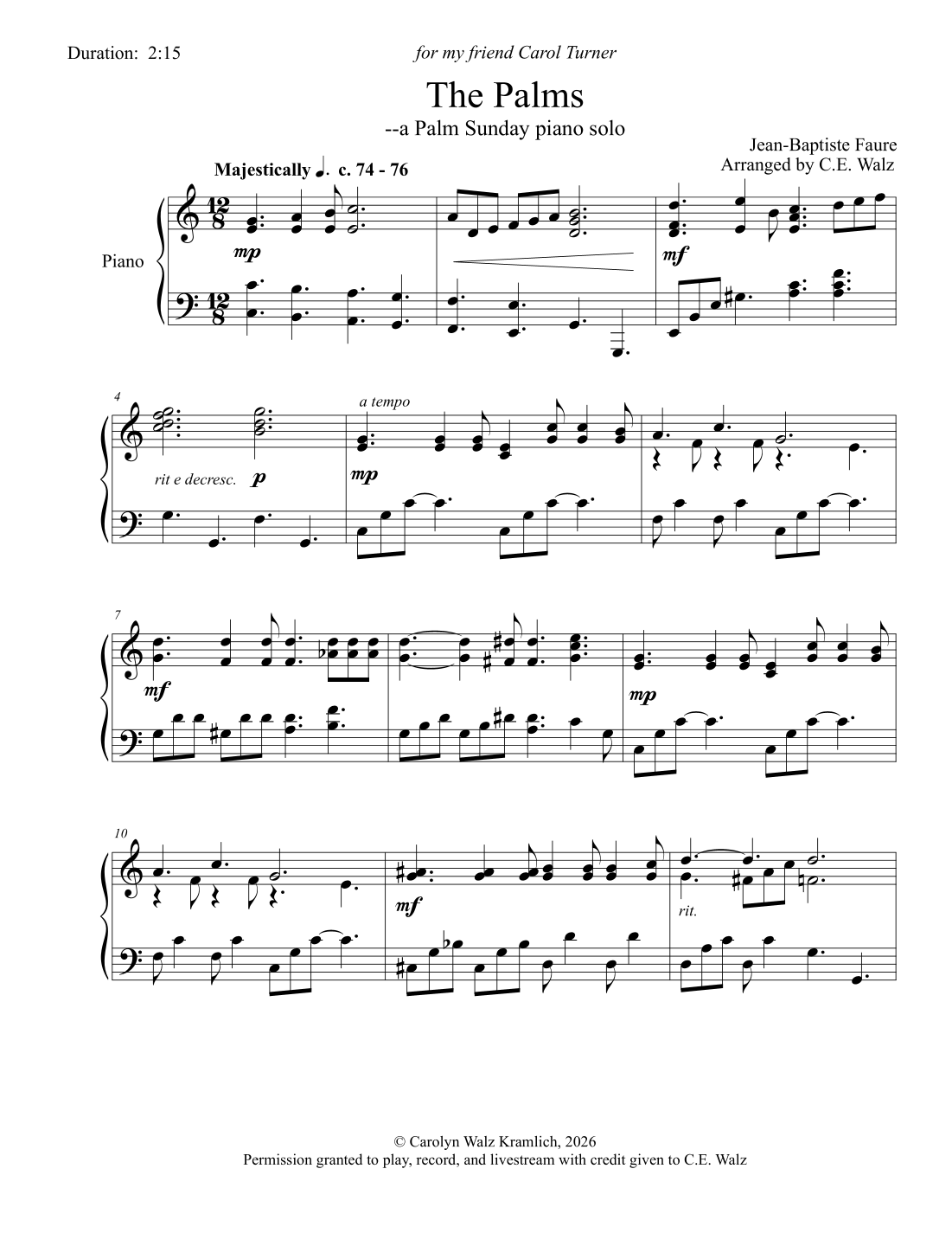 A traditional favorite vocal solo, my arrangement of "The Palms" is an intermediate three-page piano solo. The duration is approximately 2:15 minutes. I placed it in the key of C with no modulations. This piece makes a majestic prelude for Palm Sunday, especially with children or congregants waving palm leaves down the aisle.