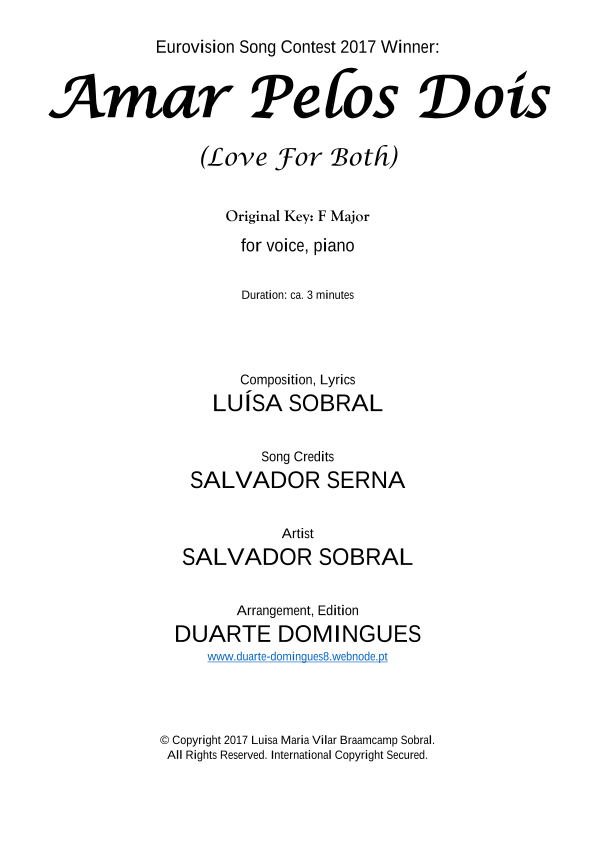 Eurovision Song Contest 2017 Winner Song: "Amar Pelos Dois" (Love for Both). Arrangement for piano and male voice (baritone or tenor, although it can be sung by female voices, an octave above the written). *Now with improved engraving quality and legebility.*