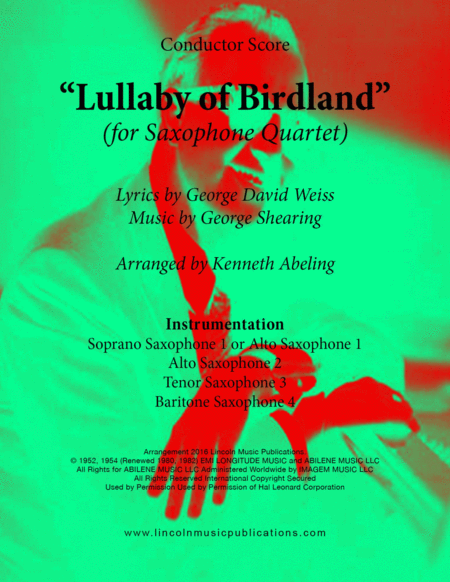 This is an advanced arrangement for Saxophone Quartet SATB or AATB of George Shearing's "Lullaby of Birdland". The arrangement features individual solos as well as numerous soli and tutti sections and while a little challenging, it is a lot of fun to play. Both Soprano and Alto for Soprano parts are included. For hundreds of other arrangements by Kenneth Abeling please visit: www.lincolnmusicpublications.com playing time 3:25.
