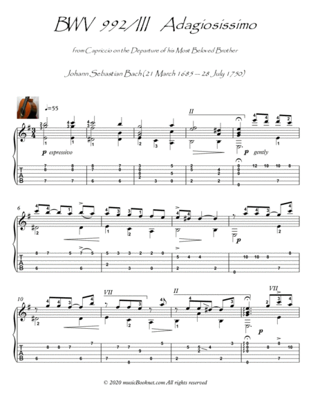 Purchase of Bach for Guitar BWV 992 Adagiosissimo (arr. PianoSheetNow) includes:
