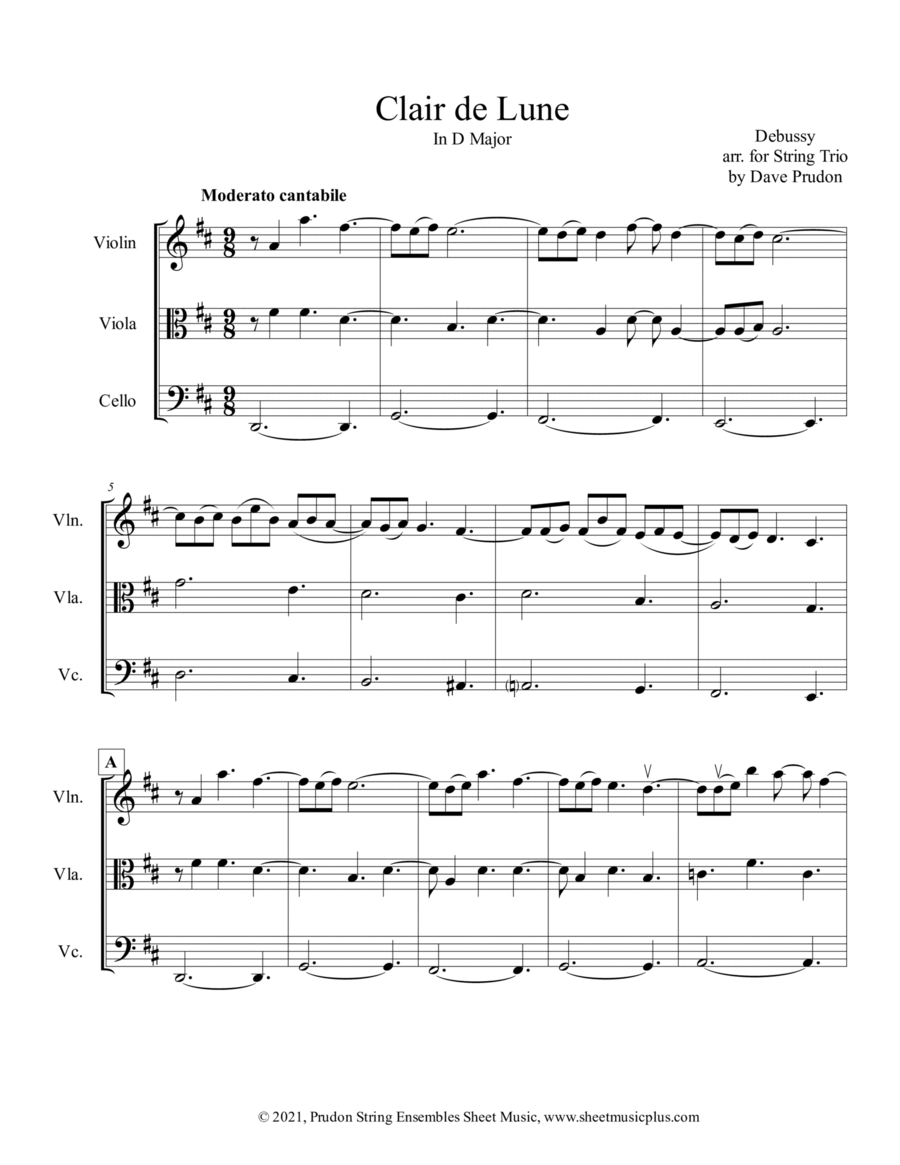 Clair De Lune in D Major for String Trio (arr. Dave Prudon) by Debussy Sheet Music for String Ensemble at Sheet Music Direct