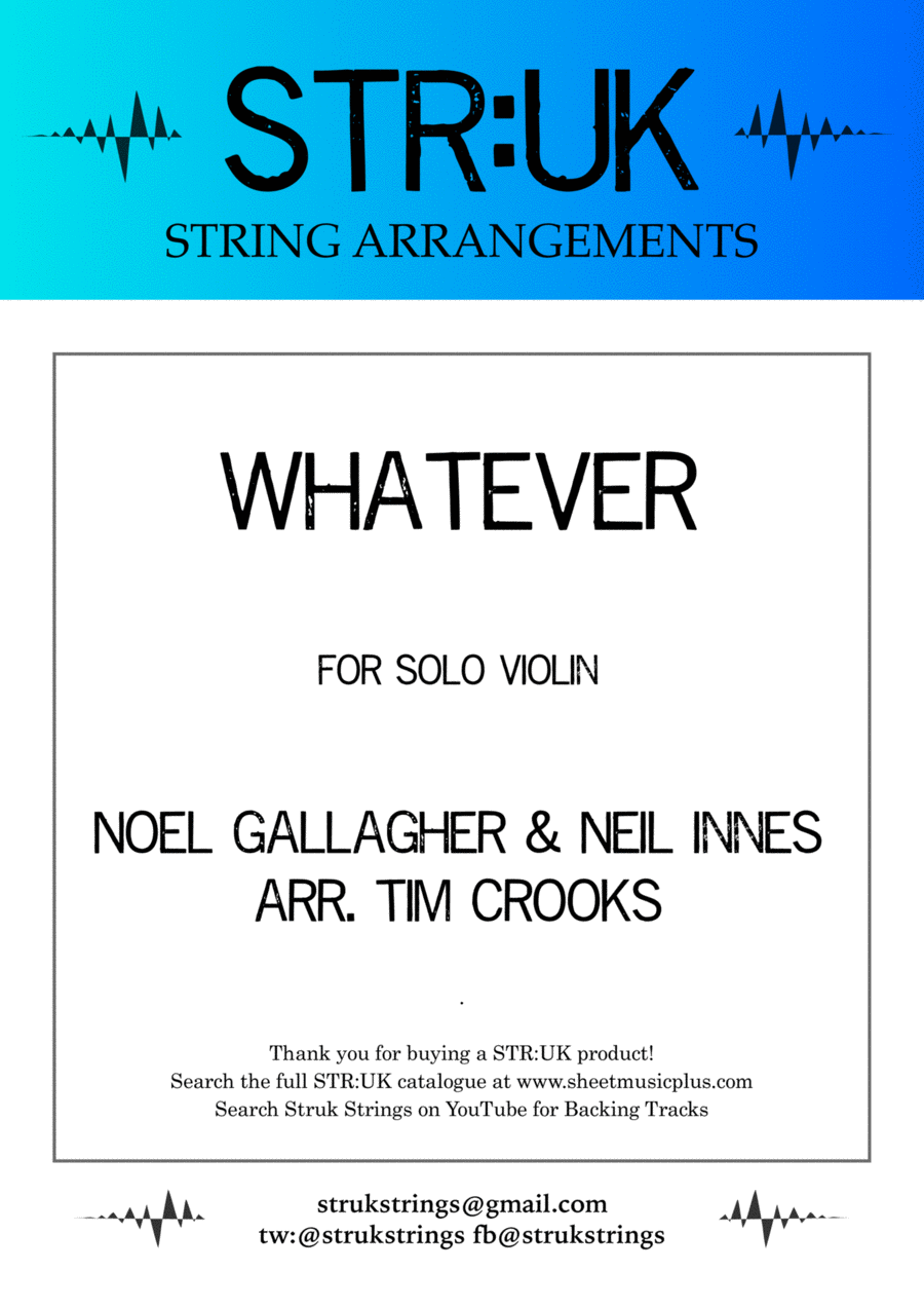 A sheet music download version of 'Whatever' by Noel Gallagher and Neil Innes (Oasis), arranged for solo violin & piano by Tim Crooks.