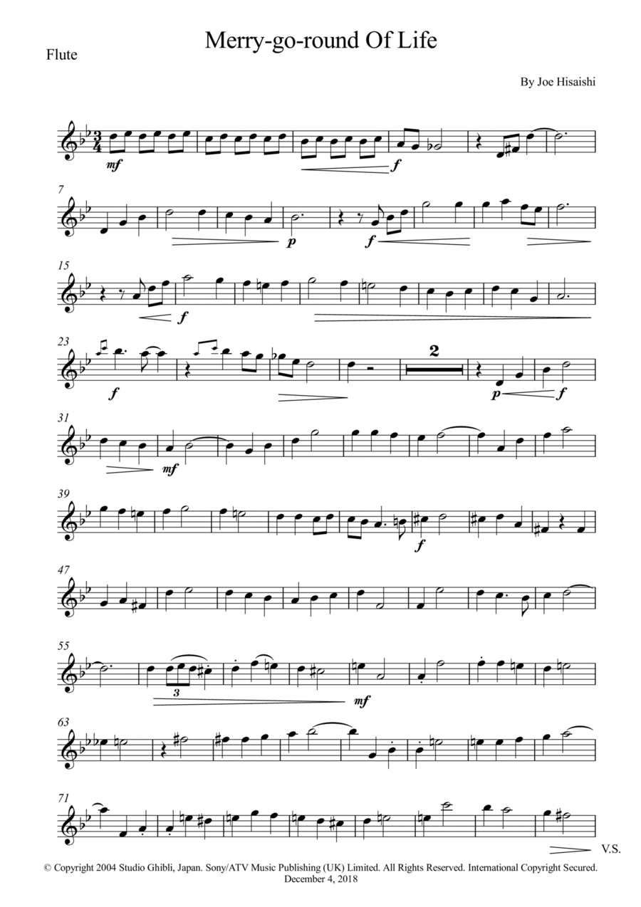 Aperçu interactif Partitions numériques> de 'Merry-go-round Of Life (arr. Wesley S. SIlva' par Joe Hisaishi, Flute solo page 1